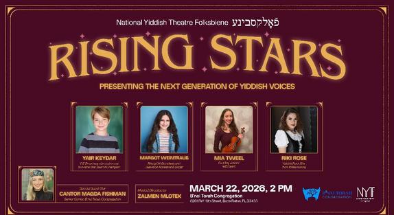 The legendary National Yiddish Theatre Folksbiene (NYTF) will join forces with B’nai Torah Congregation to unveil the Boca Raton premiere of Rising Stars - a thrilling showcase celebrating the vibrant future of Yiddish culture featuring a group of breathtakingly talented young performers.